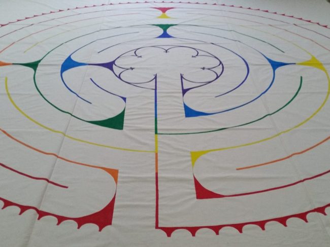 Abbiamo costruito un altro labirinto basato sul modello di Chartres…dalla cucitura della tela grazie alle preziose mani di Mamma Paola, alla tracciatura… alla pittura a mano…interamente fatto da noi 🙂 ecco alcune foto 🙂 Il risultato finale è un labirinto di 5 metri per 5, a 7 giri, che abbiamo pensato di colorare con i…